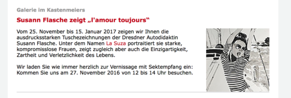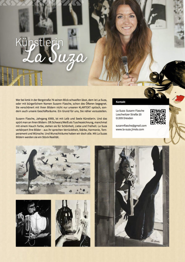 Kunst muss greifbar sein. Für La Suza ist, wie für jeden Künstler, die Interaktion mit seinem Publikum wichtig. Besonders gerne stellt La Suza daher ihre Bilder an besonderen Orten aus, beteiligt sich an verschiedenen Charity-Veranstaltungen und ist gern gesehener Gast bei Kunstausstellungen. Hier finden Sie einen Überblick über ihre Projekte der letzten Jahre. Sollten Sie an einer Ausstellung mit La Suza interessiert sein, nehmen Sie bitte Kontakt per Mail auf.