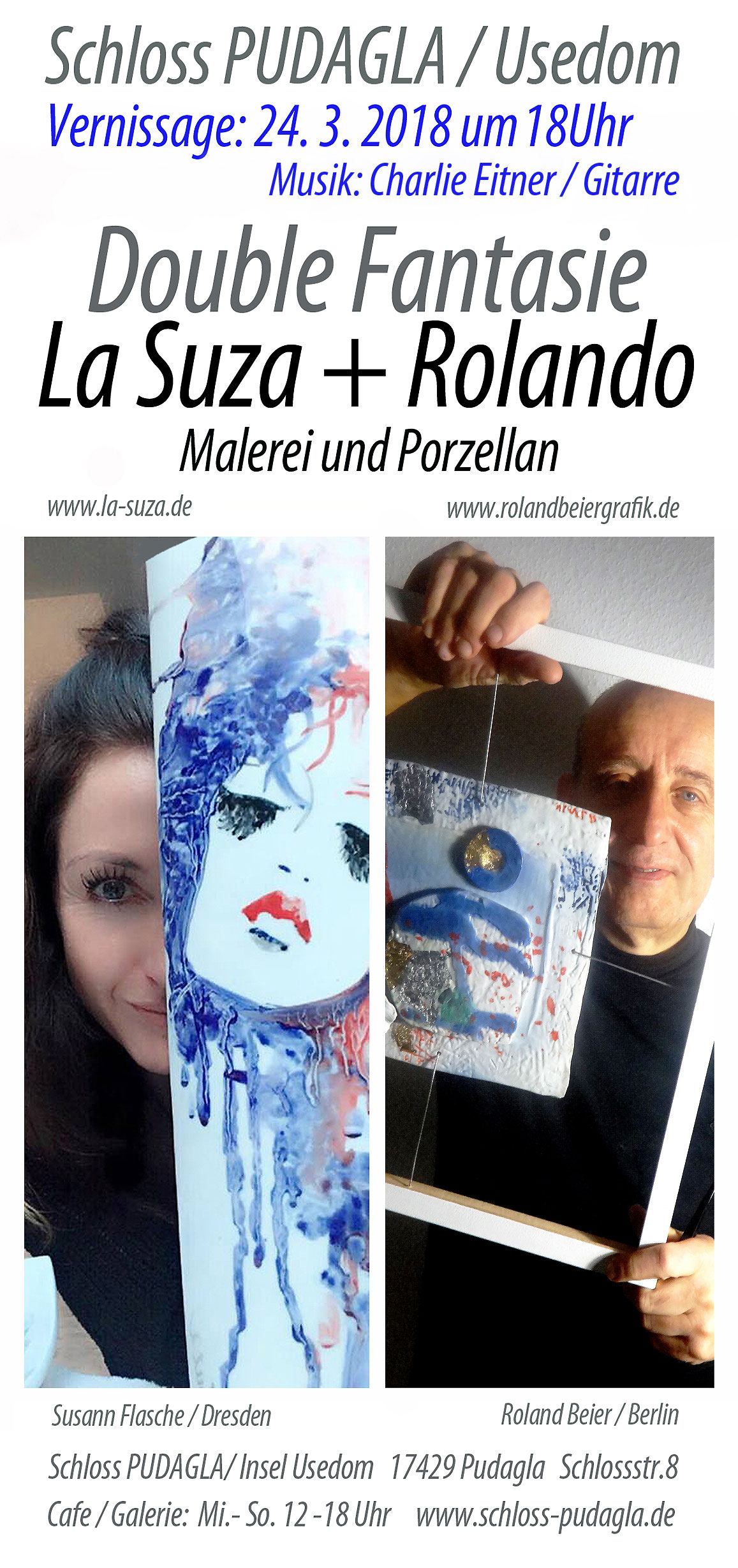 Kunst muss greifbar sein. Für La Suza ist, wie für jeden Künstler, die Interaktion mit seinem Publikum wichtig. Besonders gerne stellt La Suza daher ihre Bilder an besonderen Orten aus, beteiligt sich an verschiedenen Charity-Veranstaltungen und ist gern gesehener Gast bei Kunstausstellungen. Hier finden Sie einen Überblick über ihre Projekte der letzten Jahre. Sollten Sie an einer Ausstellung mit La Suza interessiert sein, nehmen Sie bitte Kontakt per Mail auf.